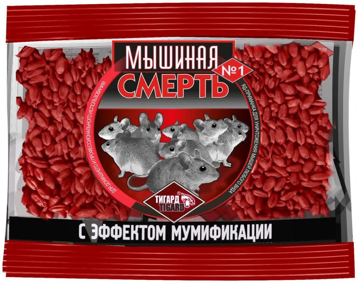 приманка предназначена для борьбы с мышами, крысами и другими грызунами приманка в виде зерна злаковых культур, с содержанием яда зерно является привычной едой для грызунов, поэтому начало поедания приманки после раскладки очень быстрое средство обладает высокой родентицидной активностью, гибель грызунов наступает на 3-7 день после поедания приманки в состав средства входит битрекс (горький компонент), не влияющий на поедаемость грызунов, но предохраняющий приманку от поедания птицами и снижает опасность случайного отравления людей, а так же нецелевых видов животных средство обладает эффектом мумификации после смерти грызуна